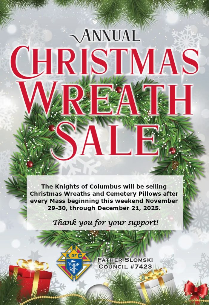 Home / Slomski Council Knights of Columbus / Knights of Columbus Wreath Sale Slomski Council Knights of Columbus Knights of Columbus Wreath Sale BySlomski Council November 26, 2025November 26, 2025 The Knights are back this year selling Christmas Wreaths and Cemetery Pillows after every Mass beginning the weekend of November 29-30. Please contact Joe Sala at 516-359-3901 with any questions! Thank you for your support!